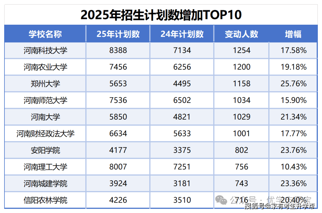 下表为河南省内招生打算添加top10院校。打算数添加前三名别离为河南科技大学、河南农业大学和郑州大学,添加打算数别离为1254、1200和1158,申明这些学校正在教育资本和容量上的显著扩展。