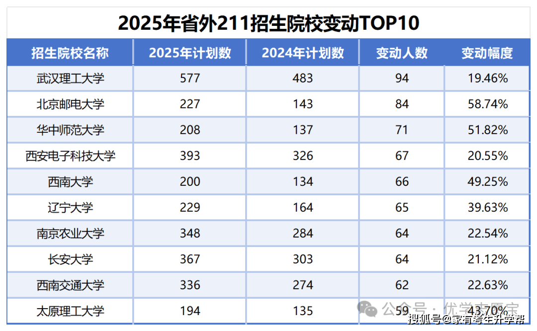 下表展现的是2025年面向河南招生的211院校的招生打算数变更TOP10高校,这里的211统计不包含985高校,能够看出变化幅度要比985院校大。